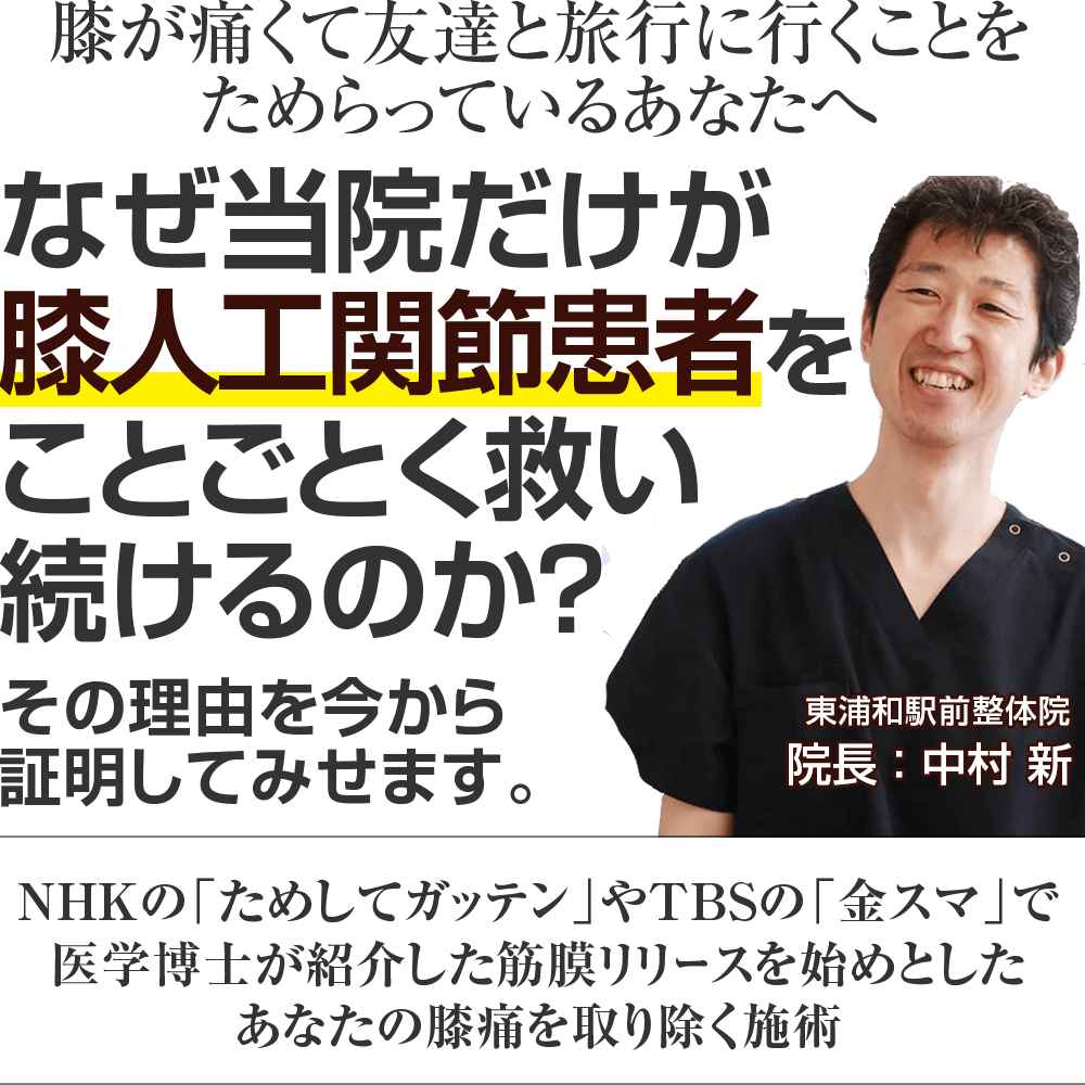 カラダのプロである証として国家資格を持ち、数多くの難治性膝痛のお客様から支持される、NHKの「ためしてガッテン」でも紹介された筋膜リリースをはじめとした「HES整体法」という全く新しい施術法で、あなた自身と真正面から向き合ってくれるさいたま市で唯一の「膝人工関節」専門整体、東浦和駅前整体院に通院し、もう二度とその膝人工関節に我慢することのない人生を手に入れる道。